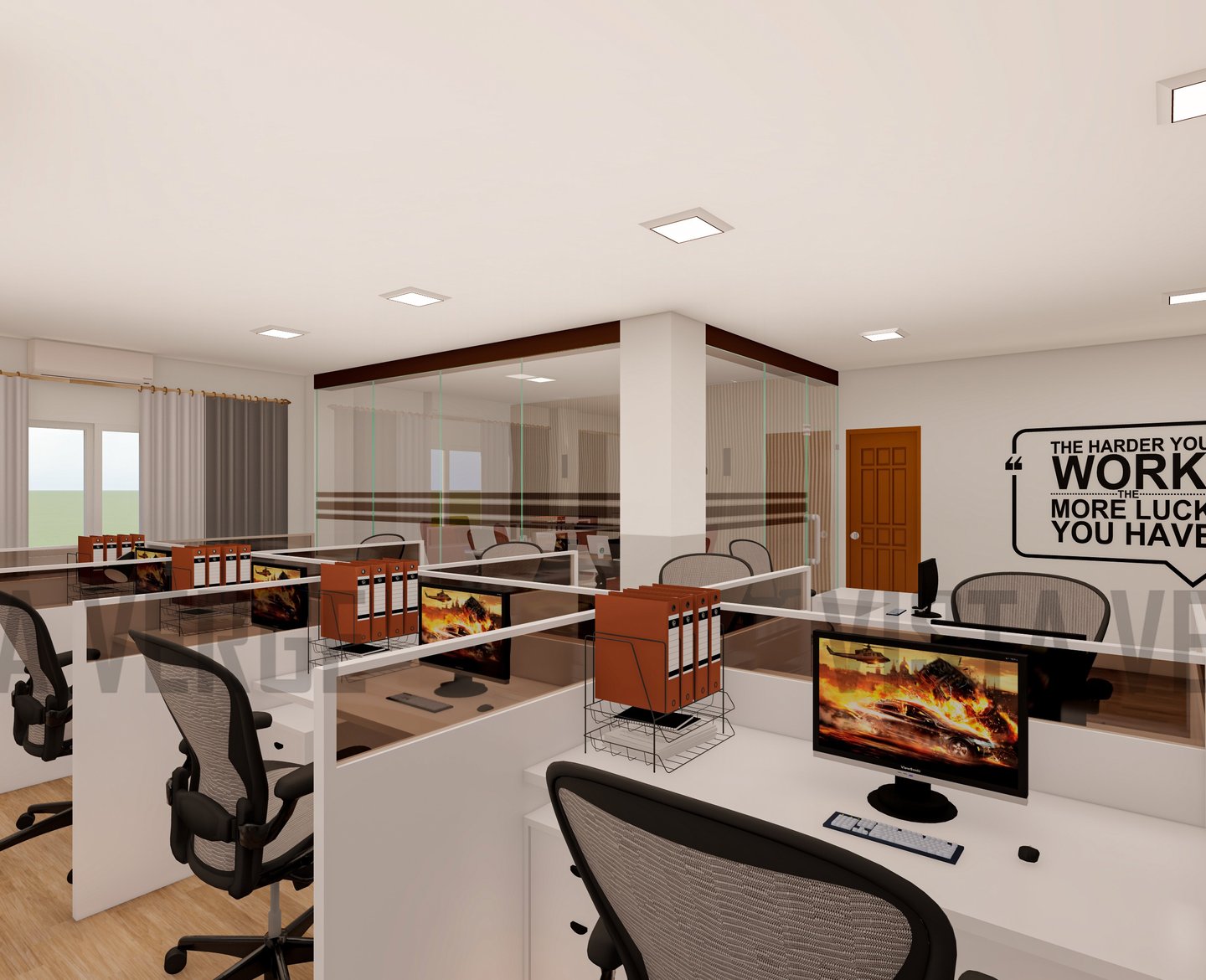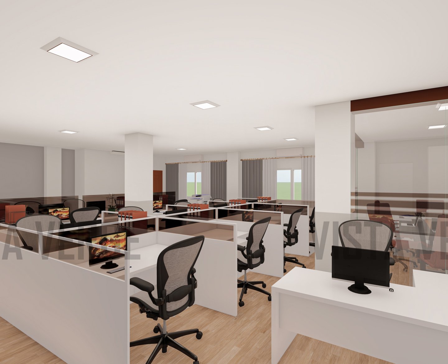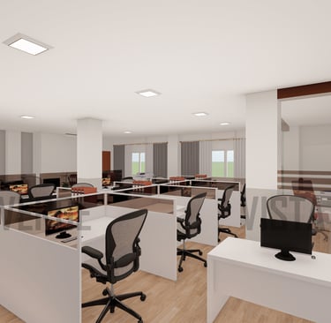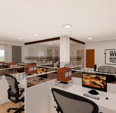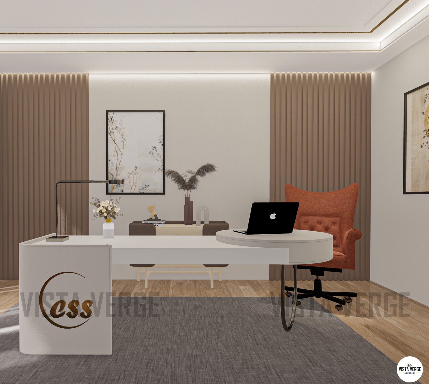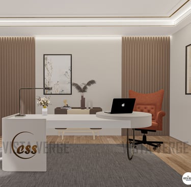 This office interior blends functionality with modern elegance. A sleek white workstation with integrated branding forms the focal point, complemented by warm wooden flooring and acoustic wall panels. The bold orange accent chair adds a creative touch to the neutral palette, while minimal artwork and soft lighting complete the professional yet welcoming ambience.