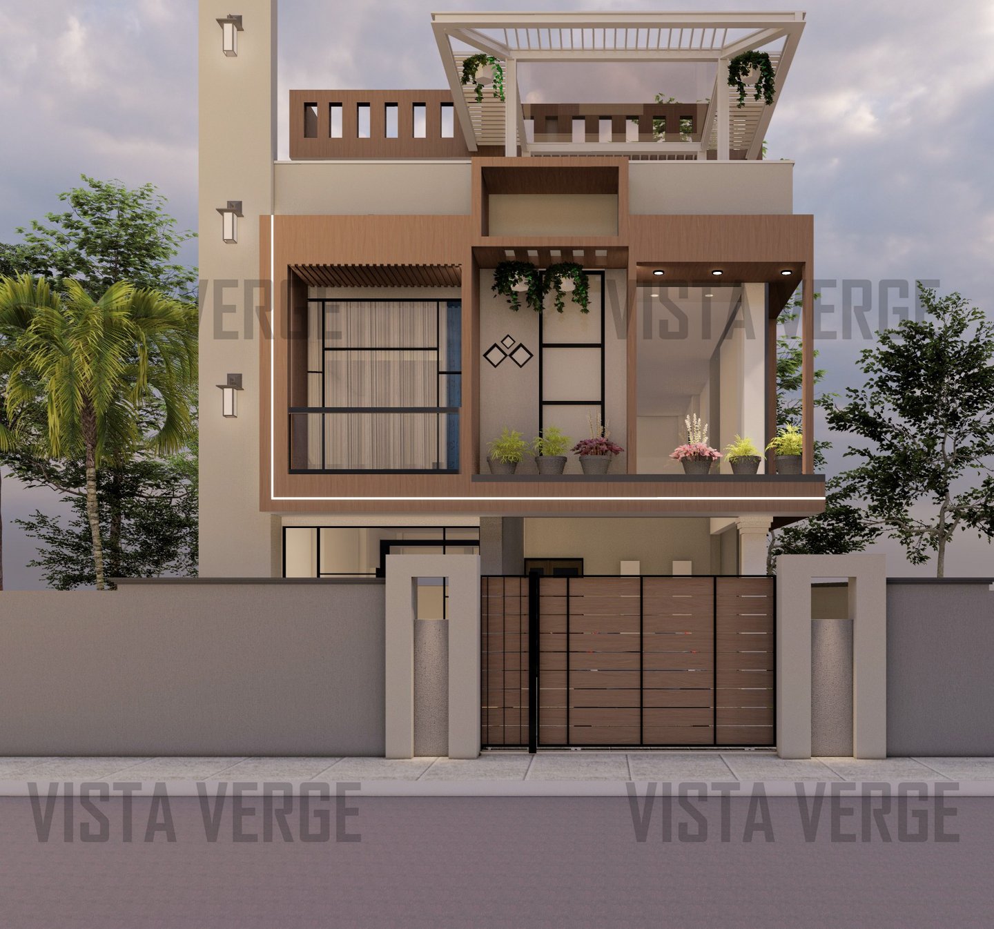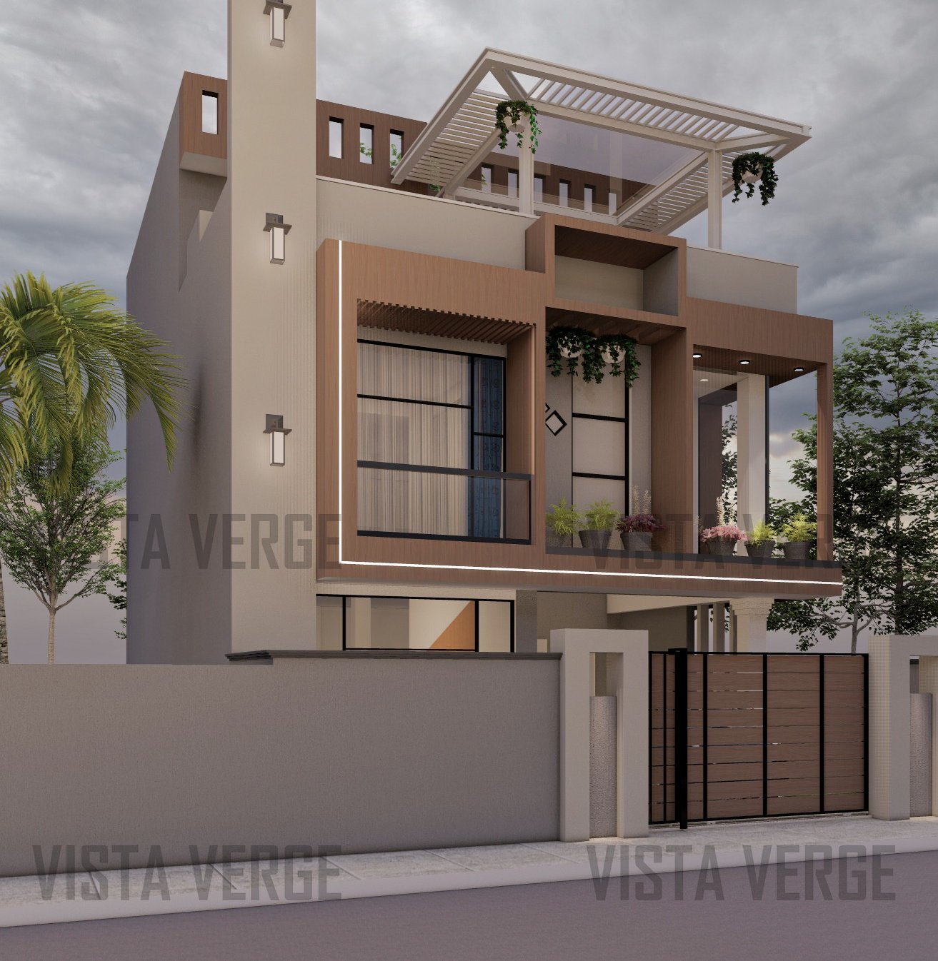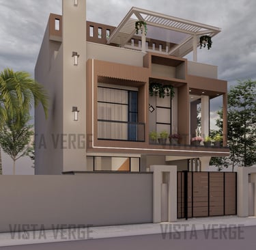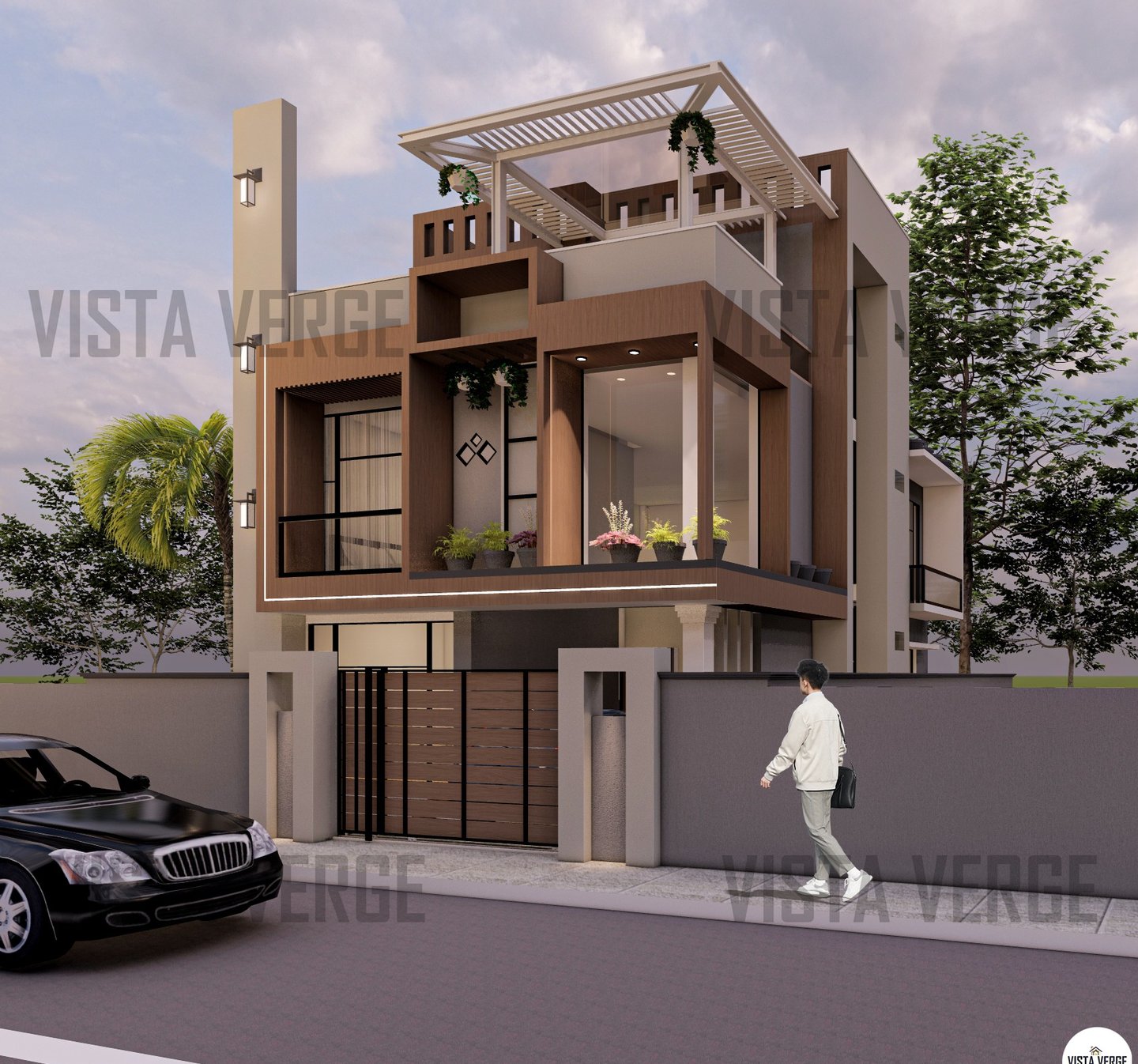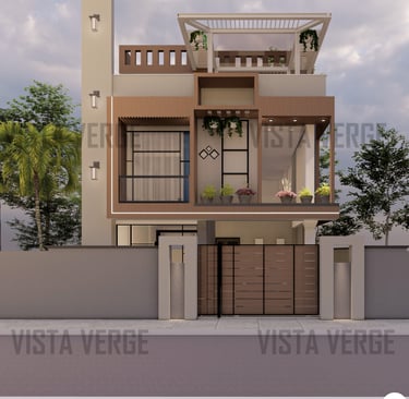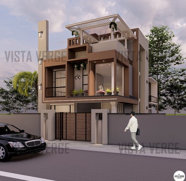 Doshi's Residence is a contemporary residential project that redefines modern living with its bold façade and thoughtful design. The exterior showcases clean geometric forms, warm wooden textures, and expansive windows that invite natural light while maintaining privacy. A terrace garden and open balcony introduce greenery into the urban lifestyle, blending nature with architecture seamlessly. The sleek entrance gate and minimalistic boundary wall enhance security without compromising aesthetics. Designed to balance elegance and functionality, this home is a reflection of sophistication, comfort, and timeless appeal.