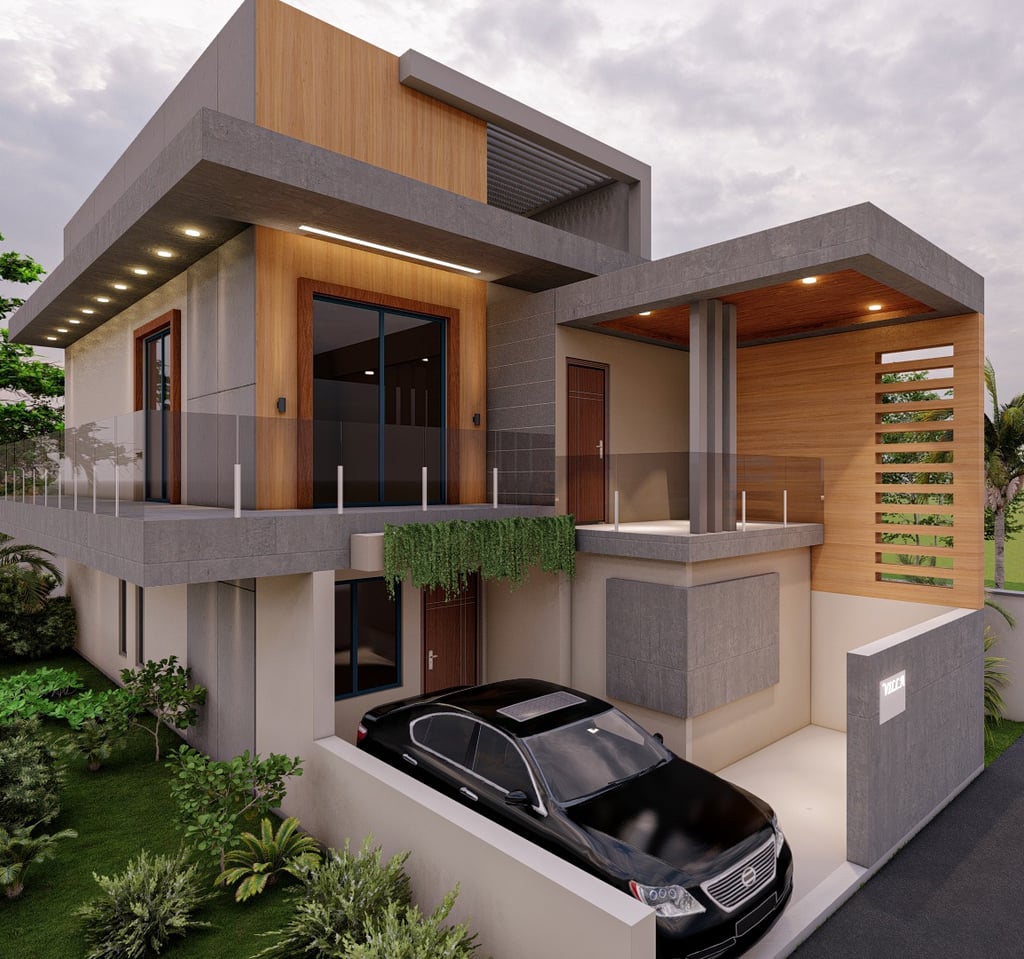 The Cantilever Vista is a contemporary masterpiece defined by its striking cantilevered upper floor, which elegantly shelters the integrated carport below. The facade features a sophisticated interplay between warm cedar-toned wood cladding and cool grey finishes. With its clean lines and thoughtful integration of greenery, this residence is the perfect fusion of bold design and highly functional urban living.